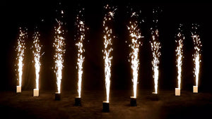 No more wires. Charge up the unit and it will run from it's built-in battery. Comes in a protective flight case with a remote control. Remote will work multiple units together. Can be controlled with DMX. Great for parties, stage shows, weddings, etc. Comes with power cable for charging and one packet of Sparkular powder. Additional powder is available for purchase. 1x unit $325 or $300 each when you take two or more.